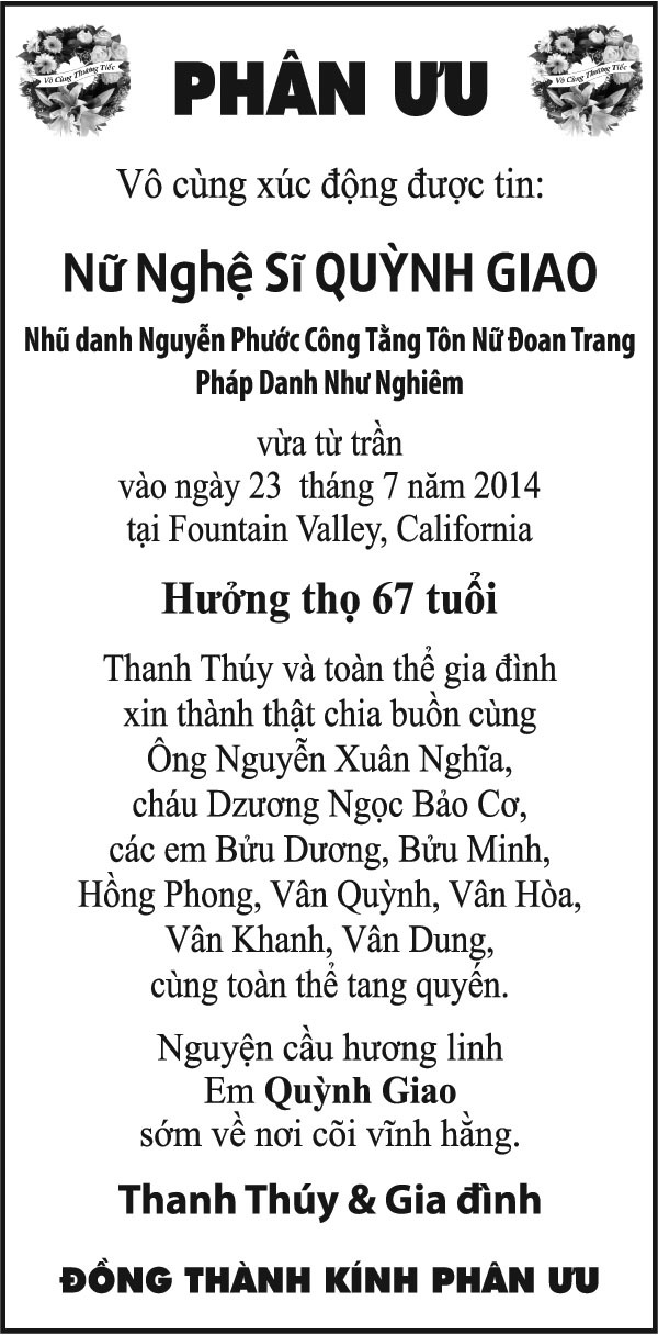 Xin chia buồn với gia đình kinh tế gia Nguyễn Xuân Nghĩa, Cầu mong hương hồn chị Quỳnh Giao được siêu thoát.