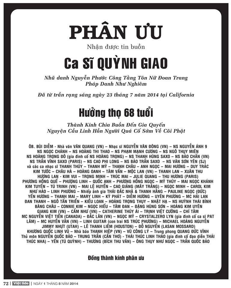 vừa từ trần vào ngày 23 tháng 7 năm 2014 tại Fountain Valley, California
