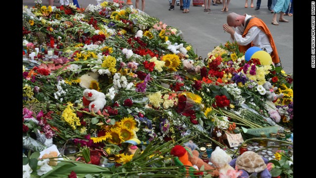 A Buddhist prays as people lay flowers and light candles in front of the Embassy of the Netherlands in Kiev on July 18, 2014, a day after a Malaysian Airlines flight MH17 carrying 295 people from Amsterdam to Kuala Lumpur crashed in eastern Ukraine. Global demands mounted Friday to find those responsible for apparently shooting down th plane over rebel-held eastern Ukraine as relatives around the world mourned the deaths of the 298 people on board. AFP PHOTO/ SERGEI SUPINSKY (Photo credit should read SERGEI SUPINSKY/AFP/Getty Images)