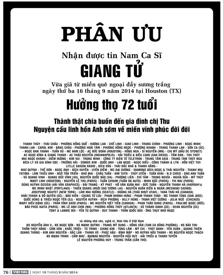 vừa từ trần vào ngày 16 tháng 9 năm 2014 tại Houston, Texas