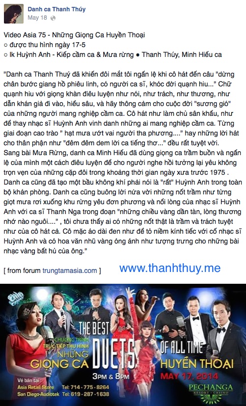 Th3 16 2015 Danh ca Thanh Thúy – fb https://www.facebook.com/danhcathanhthuy Khám phá thêm từ Thanh Thúy Đăng ký để nhận các bài đăng mới nhất được gửi đến email của bạn. Nhập email của bạn… Theo dõi Chia sẻ: Bấm để gửi một liên kết tới bạn bè (Mở trong cửa sổ mới) Email Thích Đang tải... Related