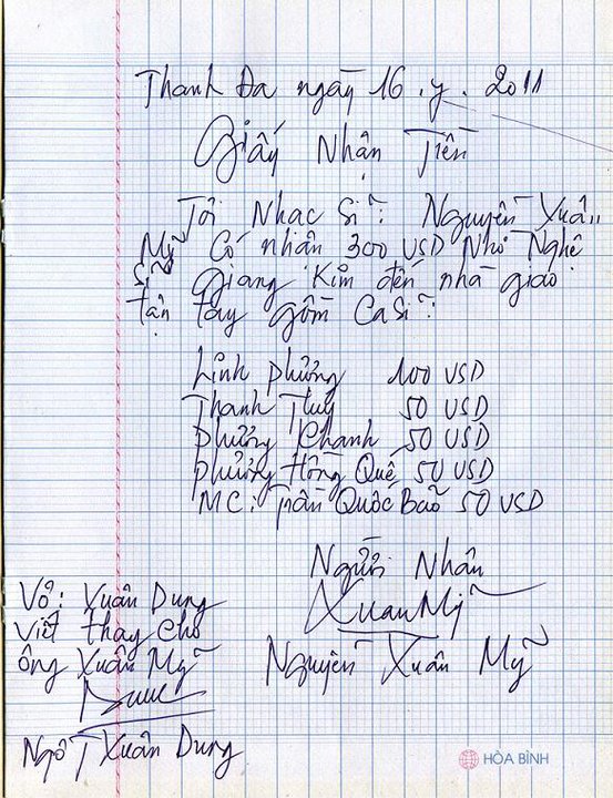 Trước tin này, 5 nghệ sĩ gồm Linh Phương, Phượng Khanh, Phương Hồng Hồng Quế, Thanh Thúy, TQB đã gọi về VN nhờ nghệ sĩ Giang Kim đến nhà chuyển giao tận tay nhạc sĩ Nguyễn Xuân Mỹ và chị đã hoàn tất trách nhiệm này vào chiều thứ bẩy ngày 16 tháng 7/2011. Đi cùng với nghệ sĩ Giang Kim còn có ca sĩ trẻ Cẩm Như, Trịnh Khánh Thiêng, Nguyễn Hữu Huy, Bảo Bảo.. đó là những người bạn có trái tim và tấm lòng nghệ sĩ chân tình. Trong lá thư tường thuật, nghệ sĩ Giang Kim đã viết: “Nhạc sĩ Nguyễn Xuân Mỹ rất cảm động khi nhận được những món quà từ các bạn phương xa gửi về. Kim tin rằng những giọt lệ Ông đã rơi không chỉ vì con số vài trăm dollars mà chính vì còn có những người bạn còn nhớ, còn quý thương Ông, một người nhạc sĩ đã 85 tuổi già yếu, bịnh hoạn và tưởng đâu đã bị chìm trong quên lãng..”