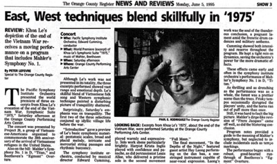 Nhạc sĩ Lê Văn Khoa trên nhật báo The Orange County Register sau buổi trình diễn đầu tiên với Pacific Symphony Institute Orchestra ở Orange County Performing Arts Center, ngày 3 tháng Sáu, 1995. (Hình: Lê Văn Khoa cung cấp)
