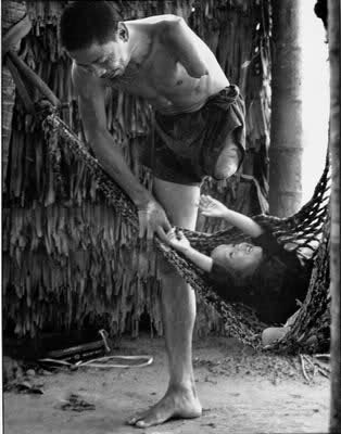 “Năm 1973, tôi nghe rằng ở Bạc Liêu có một người như trong hình, tức là bị cụt tay chân nên đến đó nhờ ông tỉnh trưởng dẫn tới nhà chụp hình. Ðây là một anh Nhân Dân Tự Vệ trong thôn có nhiệm vụ mở đường mỗi sáng. Một buổi sáng anh xâm được quả mìn Việt Cộng gài đêm trước, sắp đưa được nó lên thì quả mìn phát nổ. Anh bị cụt một tay và một chân trái. Tới nhà anh, một ngôi nhà lá đơn sơ, chỉ có hai cha con ở nhà, người vợ đi bán buôn ở chợ. Anh nấu cơm, cho gà ăn, giặt quần áo, và làm tất cả mọi việc có thể làm để giúp vợ. Ðến khi anh ru con anh ngủ thì tôi biết rằng mình đã gặp một tuyệt tác phẩm. Anh quên hẳn mình là người tàn tật đùa với đứa con trai nằm trên võng, thằng bé cũng đùa với bố một cách vô tư và hạnh phúc.”