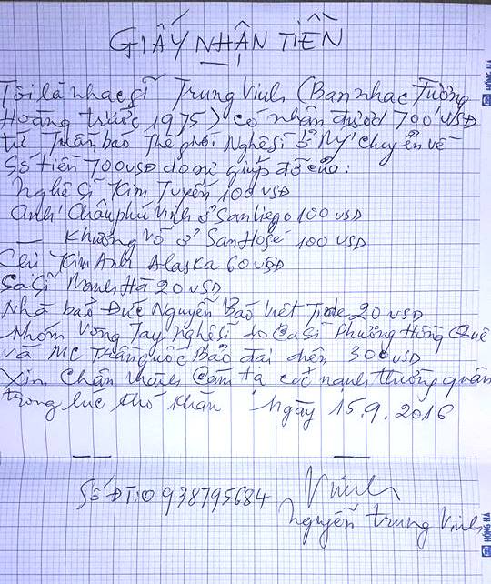 Lá thư của Xuân Vinh làm nhiều người rơi nước mắt, trong đó có vài thân hữu của tuần báo Thế Giới Nghệ Sĩ – Việt Tide. Chỉ trong vòng vài tiếng kêu gọi những tình thân, Thế Giới Nghệ Sĩ đã nhận được số tiền 700$ để gửi ngay về cho nghệ sĩ Giang Kim, từ đó chị sẽ đến tận nơi anh ở để trao cho anh số quà này. Dưới đây, là những hình ảnh mới nhất của nhạc sĩ Trung Vinh cũng như giấy biên nhận số tiền 700$ từ những đóng góp sau đây: – Nghệ sĩ Kim Tuyến: 100$ – Anh Khương Võ (San Jose): 100$ – Anh Châu Tú Vinh (San Diego): 100$ – Ca sĩ Mạnh Hà: 20$ – Nhà báo Đức Nguyễn: 20$ – Chị Kim Anh (Alaska): 60$ – Nhóm Vòng Tay Nghệ Sĩ (do ca sĩ Phương Hồng Quế và MC Trần Quốc Bảo đại diện): 300$