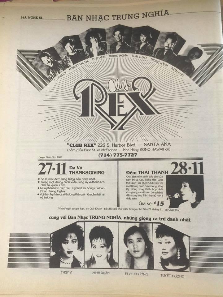 Cũng nên nhắc lại, tháng 11 năm 1986, Anh Phạm Văn Bạch khai trương vũ trường Rex (ngay góc Harbor và First – thành phố Santa Ana) với thành phần ca nhạc sĩ trình diễn hàng tuần khá hùng hậu như Elvis Phương, Minh Phúc, Minh Xuân, Tuyết Hương, Thúy Vy, Billy Shane, Thái Thảo, cùng với ban nhạc Trung Nghĩa, Hoàng Thi Thi, Trung Hành, Tuấn Đức, T. Lawler.
