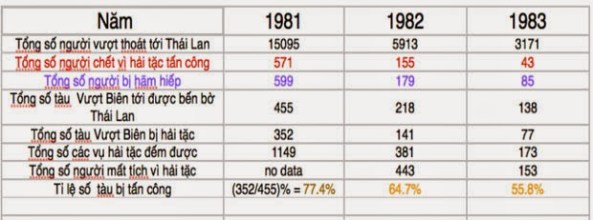 Chỉ riêng thảm họa hải tặc hãm hiếp đè nặng lên nổi nhọc nhằn của thuyền nhân Việt Nam, số liệu điều tra của UNHCR, chỉ trong ba năm 1981 đến 1983 về nạn hải tặc của Thái Lan không thôi đã như sau: