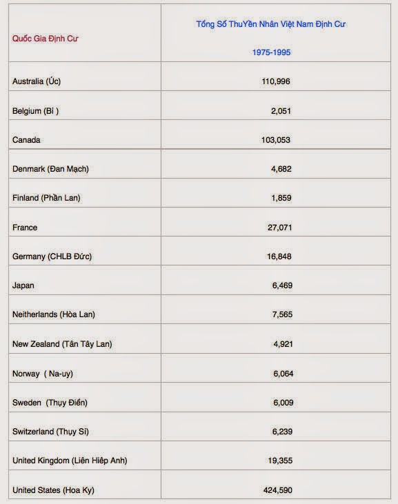 Thống kê của Cao Ủy Tỵ Nạn Liện Hiệp Quốc (UNHCR) đã cho thấy hơn 700 ngàn thuyền nhân Việt Nam đã đến được bến bờ tự do định cư rất nhiều ở Hoa Kỳ với hơn 400 ngàn người, cũng như đã có hơn 100 ngàn người bị cưỡng bức hồi huơng với lý do là nguyên quán miền Bắc, không đủ điều kiện định cư.