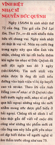 Vĩnh biệt Nhạc Sĩ Nguyễn Đức Quỳnh (Trầm Từ Đông)