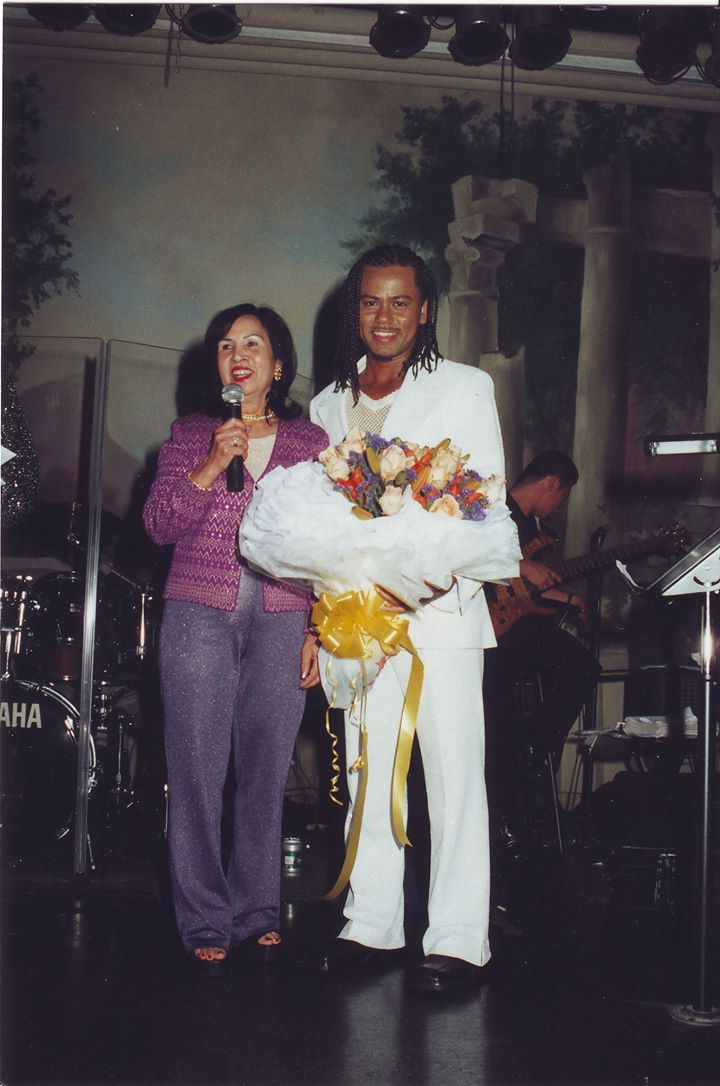 Quốc Việt tặng hoa cho mẹ nuôi là chị Nguyệt (tiệm vải Hòa Bình) trong đêm Sàigòn Màu Kỷ Niệm do Trần Quốc Bảo tổ chức năm 2005