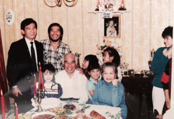 Từ trái: Nguyễn Quốc Bảo (áo vest cà vạt) và Thái (em trai) đang tham dự sinh nhật Papa Huyền Vũ. Cạnh ông là phu nhân và các cháu nội ngoại.