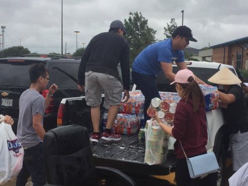 Một nhóm người Việt chuẩn bị đồ quyên góp cho các nhà tạm trú trong lụt lội. Ảnh: Kanny Le