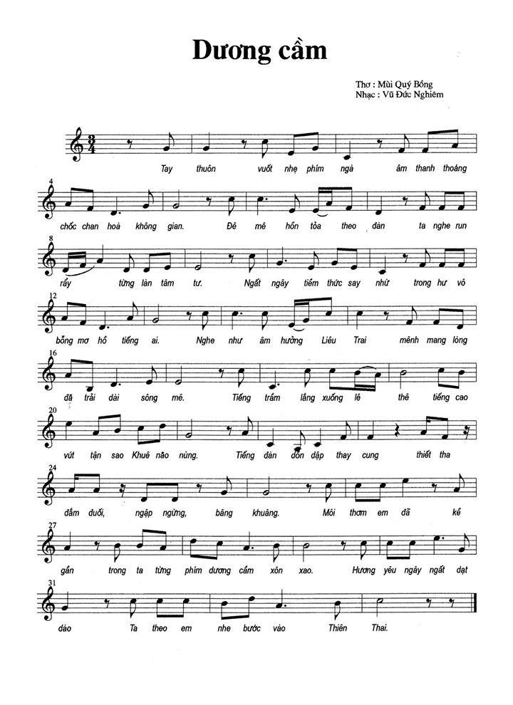 Bận rộn với công việc, thời gian sau đó tôi cũng quên đi, không nhớ đến nó. Cho đến một hôm Nhạc Sĩ Đan Thọ đưa tôi xem bản nhạc Dương Cầm ông vừa viết xong, dựa theo ý bài thơ của tôi. Ông nói ông đã có cảm hứng khi ngồi nhìn và nghe cô cháu ngoại, YLan, ngồi trước cây đàn dương cầm, tập dượt cho một buổi trình tấu của Đại Học Loyola ở New Orleans. YLan là cô con gái thứ hai của tôi và Đan Kim Tâm, trưởng nữ của Nhạc Sĩ Đan Thọ. Nhạc Sĩ Đan Thọ không viết nhiều bài nhạc, nhưng những bài ông viết, và tài nghệ sử dụng đàn violon và kèn saxophone của ông đã làm ông nổi danh từ những ngày tháng miền Nam Việt Nam còn an bình, thịnh vượng. Chắc không ai không biết bản nhạc Chiều Tím, thơ Đinh Hùng; Tình Quê Hương, thơ Phan Lạc Tuyên hay Mimosa Thôi Nở, thơ Nhất Tuấn…