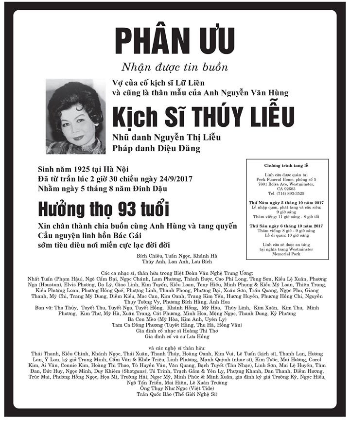 Kịch sĩ Thúy Liễu, tên thật Nguyễn Thị Liễu, sinh năm 1925 đã từ giã trần gian lúc 2g30 chiều Chủ Nhật ngày 24 tháng 9 năm 2017 tại Quận Cam (Cali). Hưởng thọ 92 tuổi.