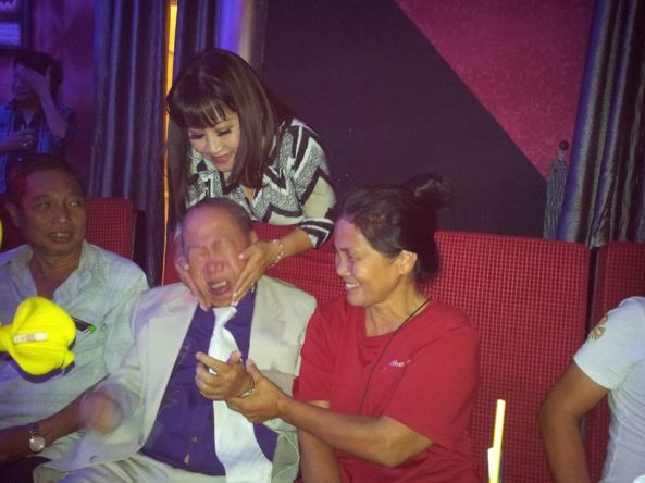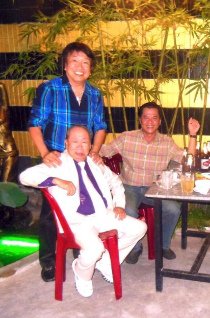 Trần Quốc Bảo chụp lưu niệm với danh hài Tùng Lâm ngày 12 tháng 5 năm 2014 tại Saigon. Phía sau là ca sĩ Quang Bình cũng là chủ quán nhậu này.