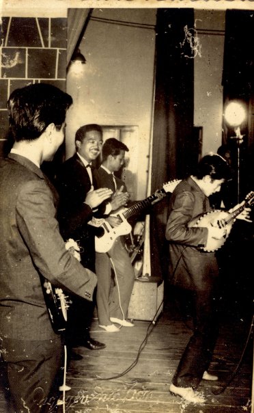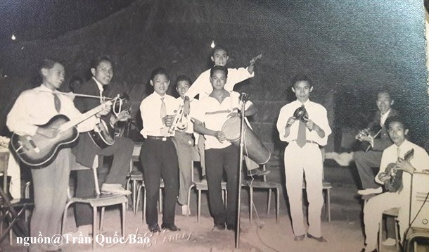 Ảnh chụp tháng 7 năm 1957 tại rạp Thống Nhất với Nguyễn Long, Lê Duyên (mandolin), Ngọc Minh Hà, Khánh Băng, Huỳnh Hoa (Saxo)