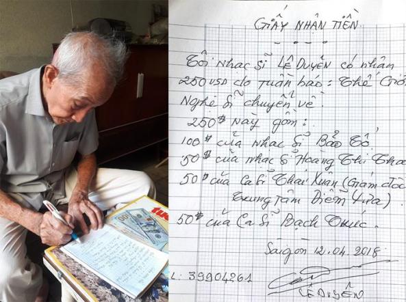 Nhạc sĩ Lê Duyên viết biên nhận đã lãnh 250 dollars do tuần báo Thế Giới Nghệ Sĩ chuyển về ngày 12 tháng 4 năm 2018. Số tiền từ Nhạc sĩ Bảo Tố (100$), ca sĩ Thái Xuân (50$), nhạc sĩ Hoàng Thi Thao (50$), ca sĩ Bạch Trúc (50$) – Photo: Giang Kim