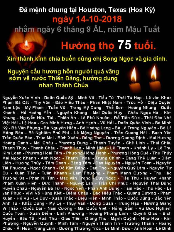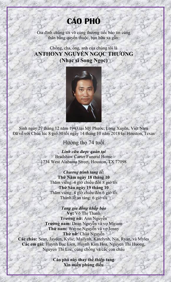 vừa từ trần vào ngày 14 tháng 10 năm 2018 tại Houston, Texas