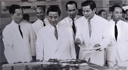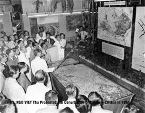 Lễ đặt viên đá đầu tiên 1962 xây Trung tâm Giáo dục Y Khoa Sài Gòn; hàng trước từ trái: GS Phạm Biểu Tâm, TT Ngô Đình Diệm, KTS Ngô Viết Thụ, GS Nguyễn Quang Trình