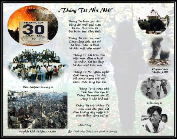 Có rất nhiều thi sĩ sáng tác Thơ cùng chủ đề đã được phổ biến trên diễn đàn và báo chí nhưng trong khuôn khổ Lá Thư Từ Đức Quốc này, từ trời Âu tôi xin mạn phép Quý Thi Sĩ (có ghi tên ở dưới) được phổ biến giới hạn vài Thơ Tranh về tháng Tư do tôi tự minh hoạt với hình ảnh góp nhặt từ internet cùng với những thi phẩm đượm tình quê hương dân tộc, diễn tả nỗi lòng của các Thi sĩ tác giả nói riêng mà tôi tình cờ hân hạnh quen biết qua sinh hoạt trong Câu Lạc Bộ Tình Nghệ Sĩ, Facebook. Theo tôi, có lẽ quý thi sĩ là người trong cuộc mượn lời thơ phác họa rõ nét hình ảnh mà thi sĩ tác giả muốn chuyển đạt, như một nhắc nhở người Việt- đặc biệt người Miền Nam của VNCH đừng quên và nên tưởng niệm Tháng Tư Đen 1975 đau buồn.!