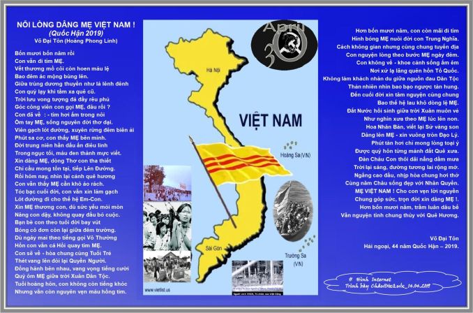 Và cuối cùng là Thơ tranh “Nỗi Lòng Dâng Mẹ Việt Nam” của Thi Sĩ Võ Đại Tôn (Hoàng Phong Linh). Tác giả là người lâu nay đấu tranh không ngừng nghỉ đã diễn tả tâm trạng của chính mình cũng như nói thay cho những đứa con Việt đang sống tha phương sau 1975 cùng tâm nguyện. Có thể nói không thiếu người Việt tị nạn cộng sản ở hải ngoại hơn 44 năm qua vẫn thủy chung với Quê Hương, vẫn giữ tư cách người tị nạn cộng sản luôn hằng ước mong ngày mai Trời lại sáng, đường tương lai rộng mở và Việt Nam sẽ không còn cộng sản để toàn dân có được một đời sống tốt đẹp với đầy đủ “Tự Do, Dân Chủ và Nhân Quyền”. Mong lắm thay.