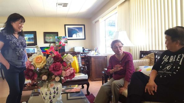 Tại tư gia ở Garden Grove, California, sáng 18/8/2017, ca sĩ Hồng Tước (trái), ca sĩ Kim Tước (giữa) và Trần Quốc Bảo đang trò chuyện, gợi nhớ những kỷ niệm về ban Tiếng Tơ Đồng của nhạc sĩ Hoàng Trọng trong dịp kỷ niệm 50 năm đại ban xuất hiện trên Đài Truyền Hình Việt Nam (photo: Thế Giới Nghệ Sĩ)