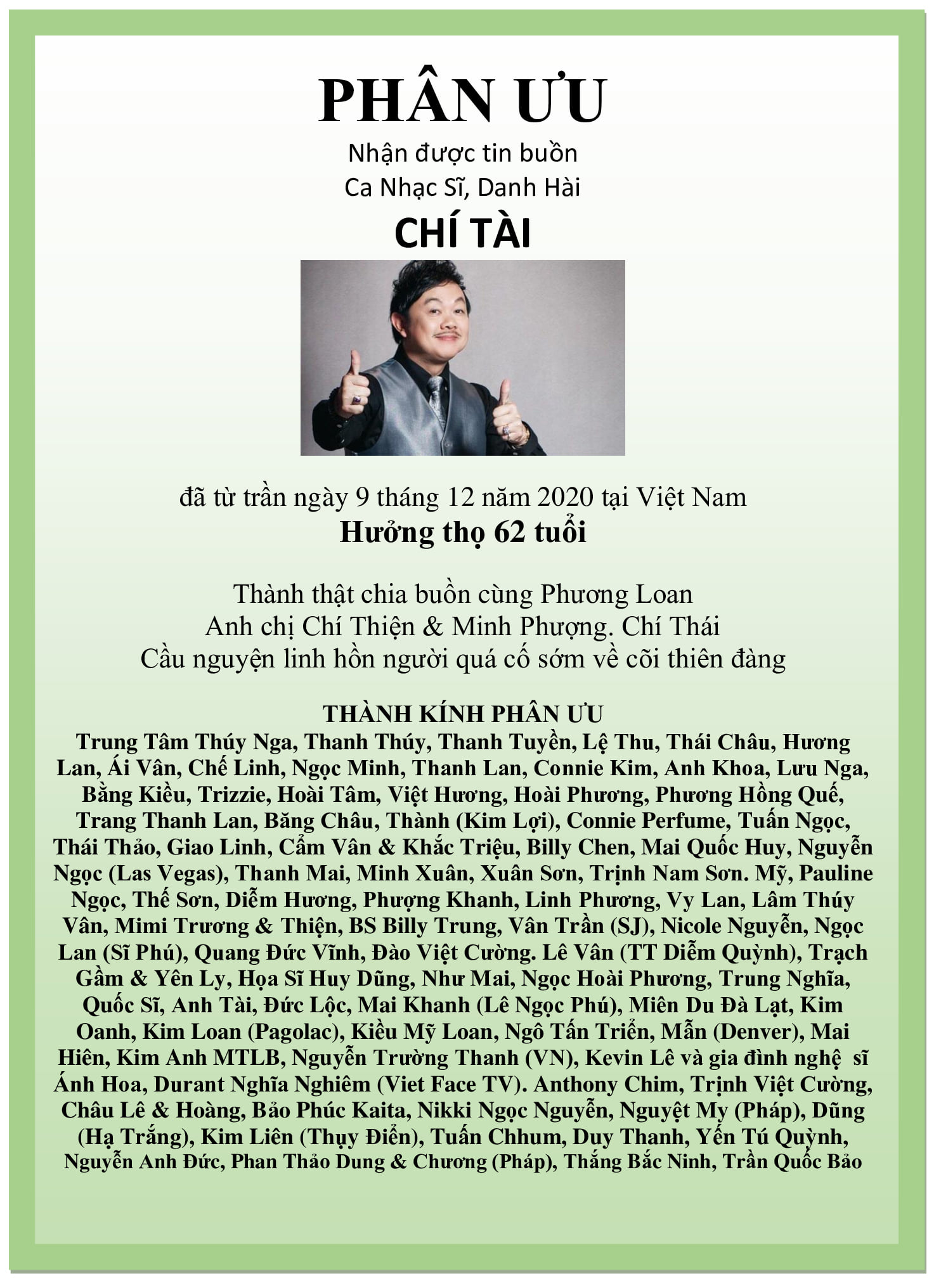 Nguyện cầu hương linh Chí Tài an nghỉ nơi cõi vĩnh hằng