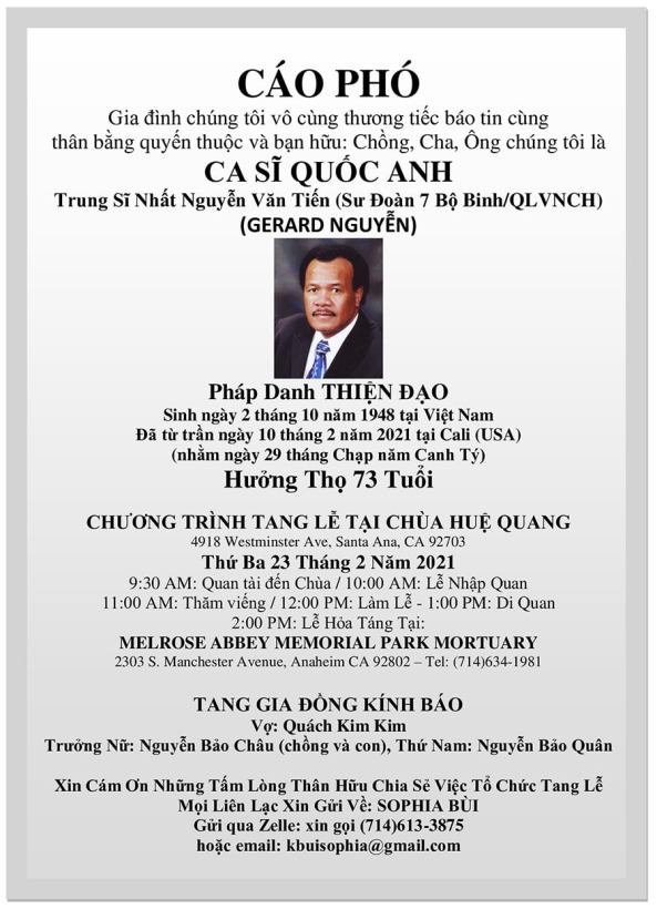 29 Tết – nhận tin buồn: ca nhạc sĩ Quốc Anh qua đời tại bệnh viện Fountain Valley vào lúc 1pm hôm nay sau một thời gian chống chọi với Covid-19