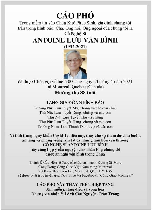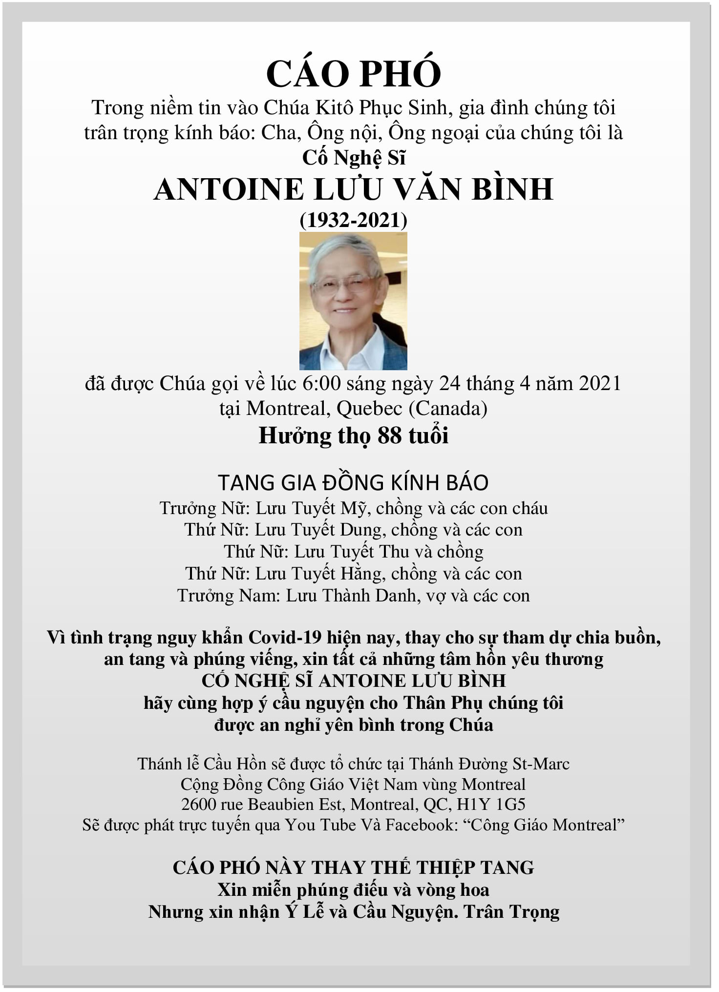Vũ Sư Lưu Bình, em ruột của tay trống Lưu Huyền (thân phụ ca sĩ Mỹ Lan) và là anh ruột của vũ sư Lưu Hồng (thân phụ ca sĩ Ý Nhi) đã nhắm mắt từ trần vào lúc 6g sáng thứ bảy ngày 24 tháng 4 năm 2021 tại Canada. Ông hưởng thọ 88 tuổi.