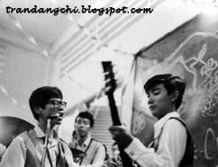 Ban Hải Âu, thành phần đầu tiên 1965, trong một buổi trình diễn tất niên tại một lớp học của trường Văn Học nằm trên đường Phan Thanh Giản. Từ trái sang phải: Lê Hựu Hà (vocal, lead guitar), Huỳnh Bá Thảo (drums), Trần Đăng Chí (rhythm guitar) – nguồn Trần Đăng Chí