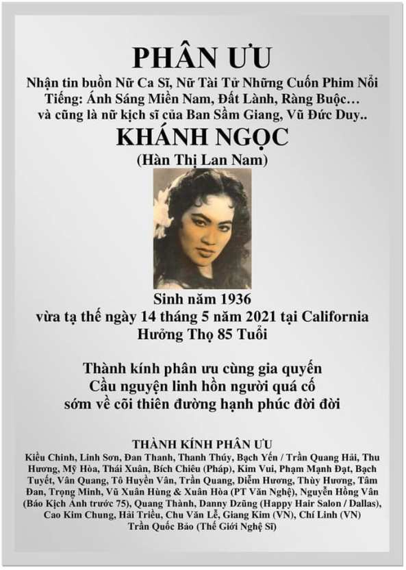 vừa tạ thế ngày 14 tháng 5 năm 2021 tại California