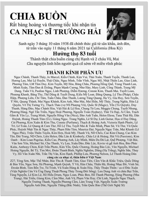 DQ xin chia buồn cùng tang quyến và cầu nguyện cho linh hồn của Bác Trường Hải được yên nghỉ trong vòng tay yêu thương của Thiên Chúa!