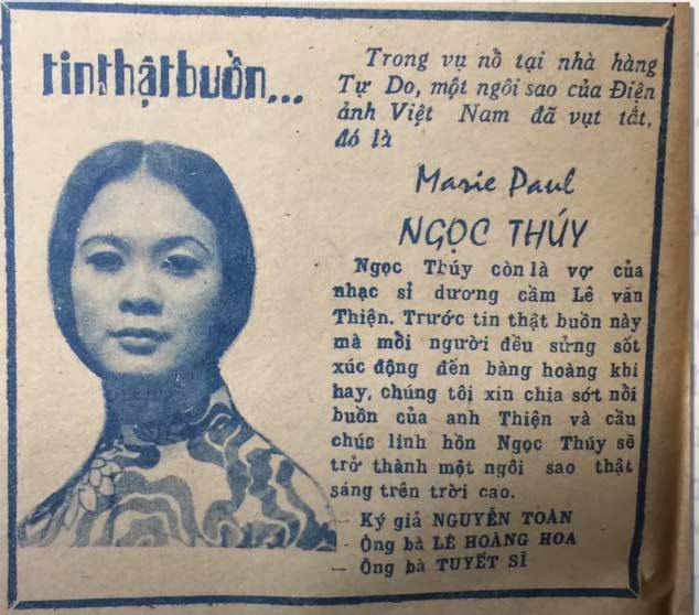 khiến cho nữ tài tử Thúy Ngọc (phim Trần thị diễm Châu, Mùa thu cuối cùng) qua đời