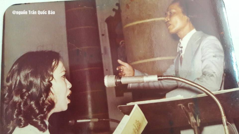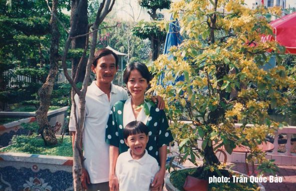 Vợ chồng Dạ Hương và con trai Thái Quyền ghé thăm Trần Quốc Bảo tại khách sạn Hương Việt tháng 2 năm 1996