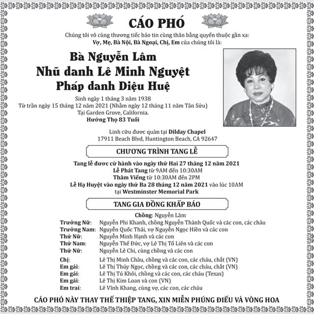 (nhằm ngày 12 tháng 11 năm Tân Sửu) tại Garden Grove, Cali