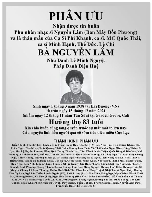 và là thân mẫu của Ca Sĩ Phi Khanh, Ca Sĩ MC Quốc Thái,