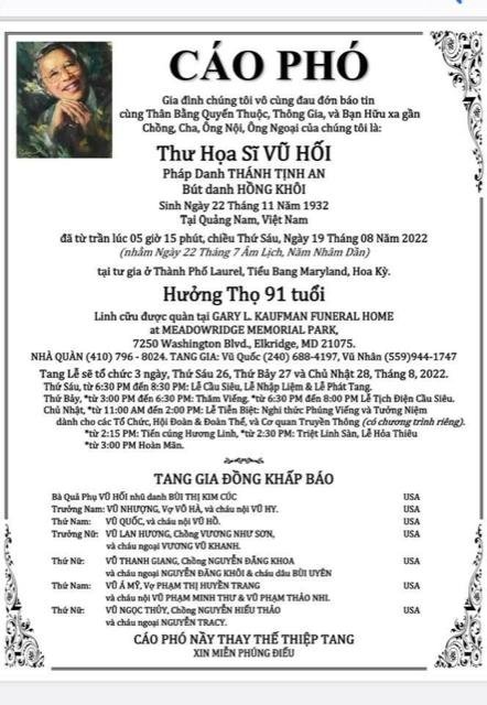 vừa từ trần vào ngày 19 tháng 8 năm 2022 tại Maryland, Hoa Kỳ