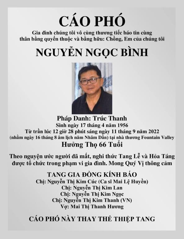 Cầu nguyện hương linh Nguyễn Ngọc Bình sớm tiêu diêu miền Lạc Cảnh!
