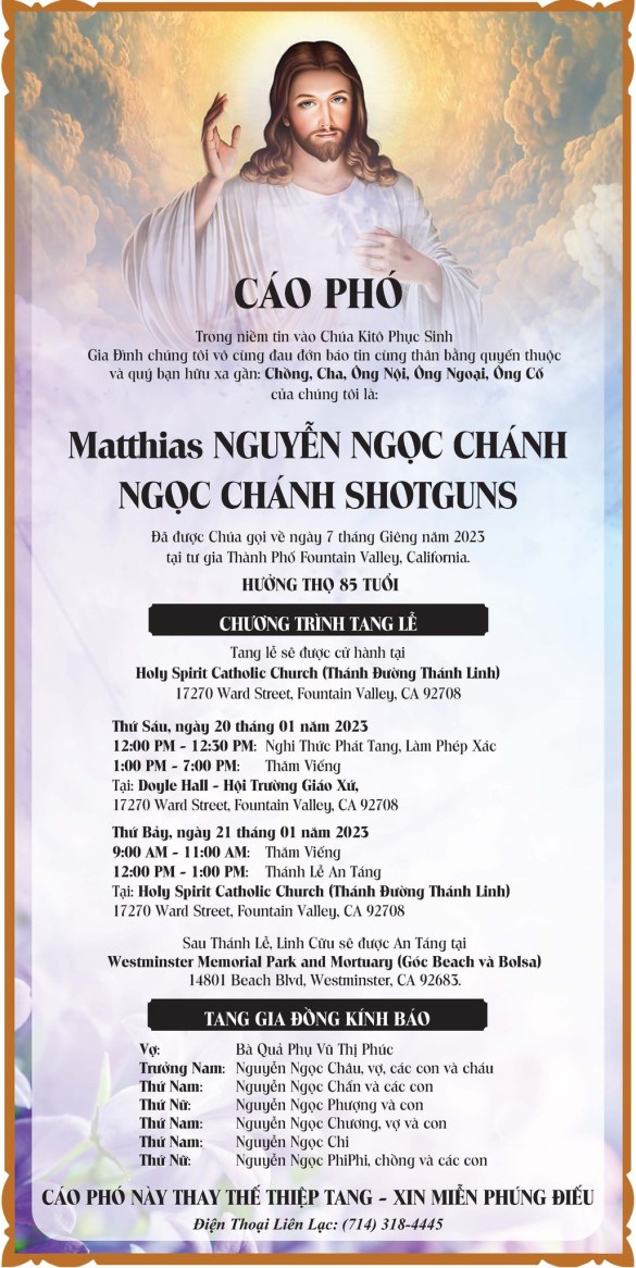 Con xin thành tâm chia buồn cùng gia đình Bác. Nguyện cầu cho bác Ngọc Chánh ra đi thanh thản và linh hồn sớm được siêu thoát! 🙏🙏🙏