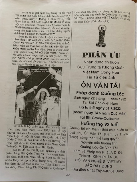 SACRAMENTO, California (NV) – Cựu Trung Tá Không Quân Ôn Văn Tài, phu quân nữ danh ca Thanh Thúy, vừa tạ thế ở Sacramento, California, vào hôm Thứ Hai, 31 Tháng Bảy năm 2023, hưởng thọ 91 tuổi.