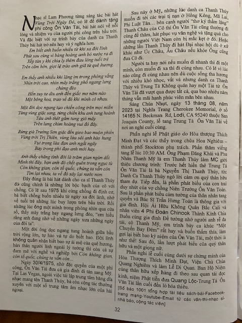 Cố Trung Tá Không Quân Ôn Văn Tài, phu quân nữ danh ca Thanh Thúy, vừa qua đời ở Sacramento, California, vào hôm Thứ Hai, 31 Tháng Bảy năm 2023, hưởng thọ 91 tuổi. Vị cựu Trung Tá Không Quân Quân Lực Việt Nam Cộng Hòa qua đời trong giấc ngủ bình yên vì tuổi già sức yếu chứ không vì bệnh tật gì. Được biết, tang lễ cố Trung Tá Ôn Văn Tài sẽ được cử hành vào Chủ Nhật, 13 Tháng Tám, từ 9 giờ sáng đến 3 giờ chiều, tại Nghĩa Trang Cherokee Memorial, ở số 14165 N. Beckman Rd., Lodi, CA 95240.