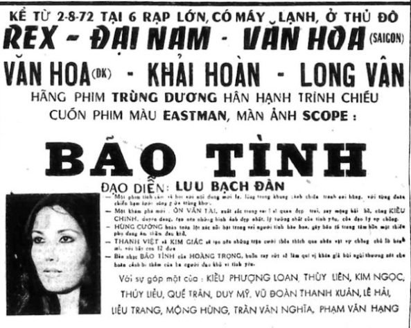 Mẩu quảng cáo phim Bão Tình với tài tử Kiều Chinh, Hùng Cường, Ôn Văn Tài… chiếu ra mắt ngày 2 Tháng Tám, 1972