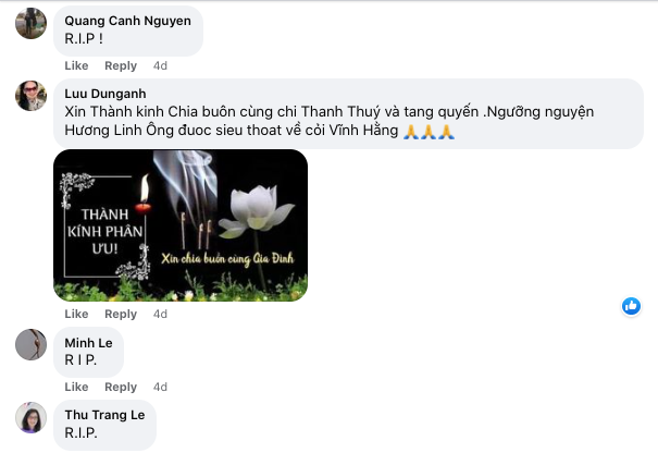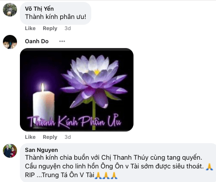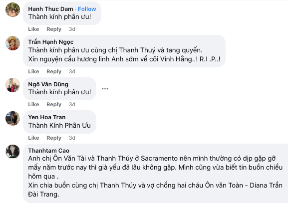 Vì đã có hơn 200 vị vào chia sẻ và phân ưu, xin quí vị vui lòng bấm vào đường dẫn phía trên để đọc. Khi nào có dịp, chúng tôi sẽ cập nhật sau. Xin thành thật cáo lỗi và cảm tạ.