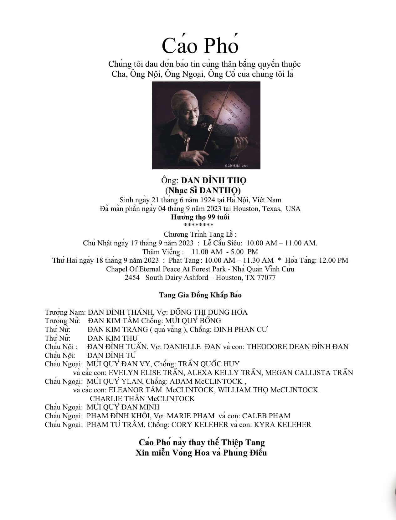 Phân Ưu cùng gia đình Nhạc Sĩ Đan Thọ