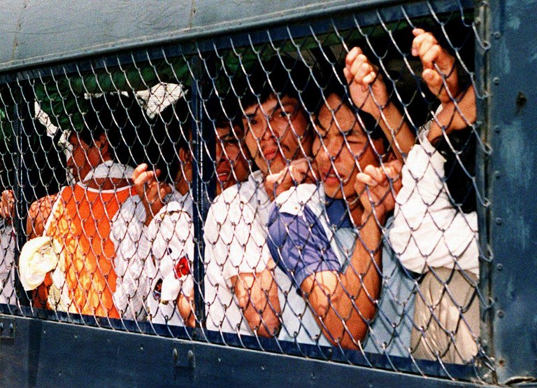 Vietnamese boat people from the Whitehead detention center are crowded into a police truck for relocation to another detention center in Hong Kong 07 April 1994. Guards fired tear gas at defiant Vietnamese inside the camp in an attempt to end weeks of protests against forced repatriation. / AFP PHOTO / TOMMY CHENG