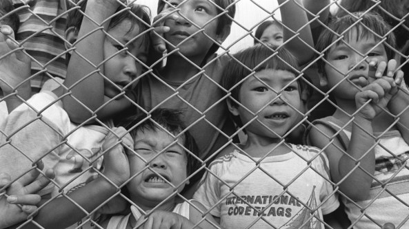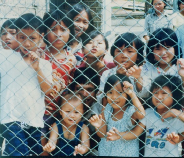 A Vietnamese refugee boy waits for his lunch at a boat people camp in Hong Kong in 1988. Tens of thousands of Vietnamese refugees fled the Communist regime by boats to Hong Kong in 1980s.