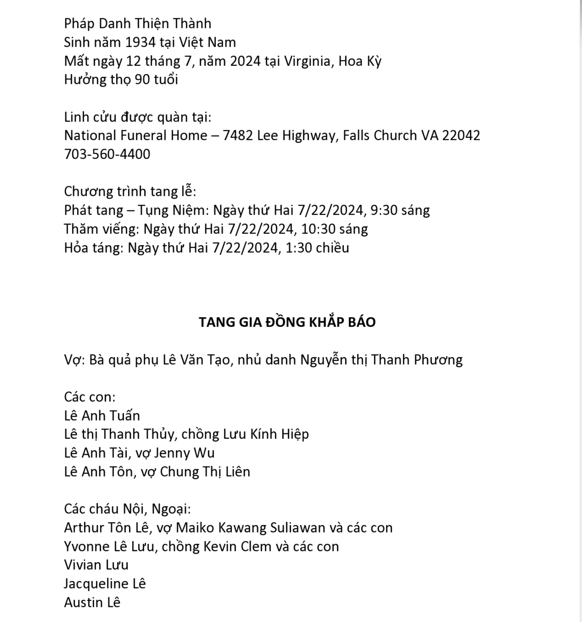 Xin nguyện cầu cho bác Tạo yên nghỉ, xin phân ưu cùng gia đình cô Thanh Phương và quý cô trong gia đình cô Thanh Thúy