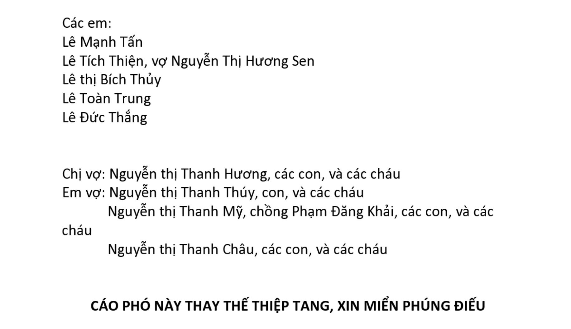 Xin chia buồn với hai chị Thanh Châu, Thanh Thúy và gia quyến.