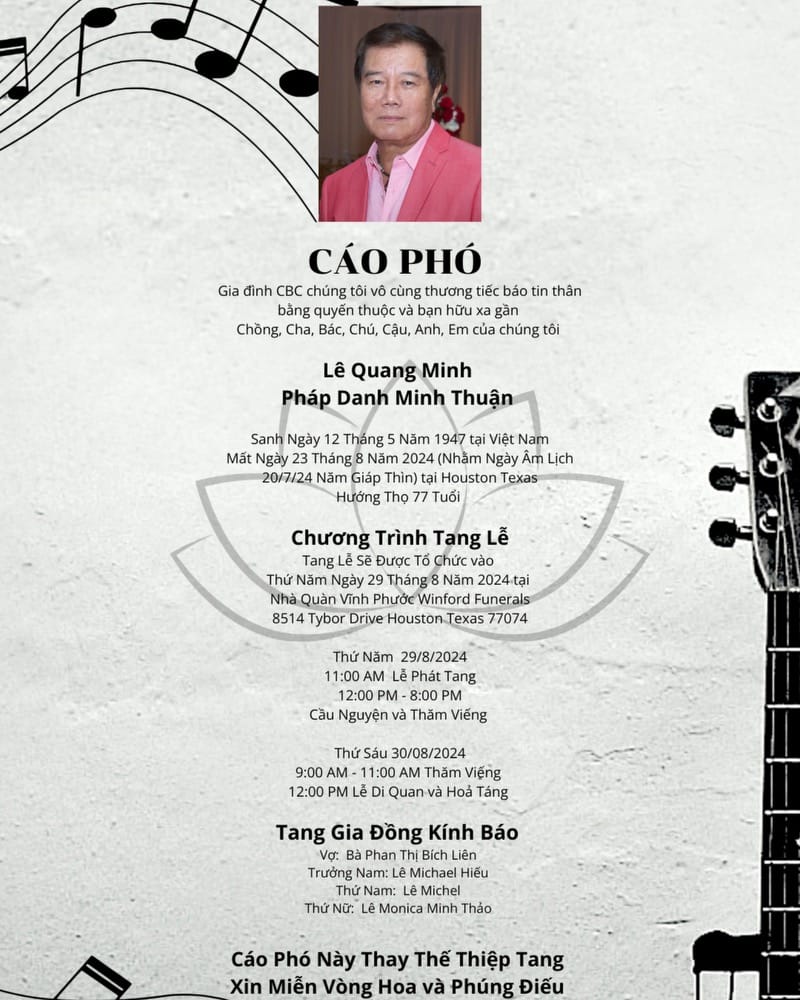 vừa từ trần vào ngày 23 tháng 8 năm 2024 tại Houston, Texas