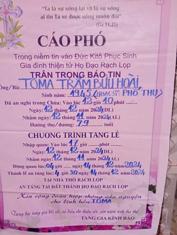Nhạc sĩ Phố Thu tác giả ca khúc Hát Nữa Đi Em, Tâm Sự Người Lính Đồn Xa… vừa qua đời hôm nay. Theo thông tin từ gia đình thông báo đến Dòng Nhạc Vàng, thì nhạc sĩ Phố Thu đã trút hơi thở cuối cùng vào lúc 1h theo giờ địa phương ngày 12/12/2024 (12/11 năm giáp thìn) tại Trà Vinh.